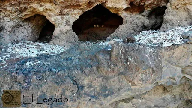 Imagen tomada desde un dron en la que se observa la magnitud de la cueva y los miles de huesos allí acumulados y desperdigados. / El Legado.Un grupo de entusiastas de la arqueología que trabajan bajo la denominación de 'El Legado' acaba de descubrir la que, según los expertos, es «la mayor cueva funeraria aborigen de Gran Canaria». Los cálculos son estimativos, pero podría albergar a decenas de individuos. A simple vista se aprecian numerosos restos óseos, revueltos y desperdigados tanto dentro como fuera de la cavidad, por lo que todo apunta a que este enterramiento de filiación prehispánica ha sido ya expoliado. 'El Legado' alertó al Cabildo de este hallazgo, que ya ha iniciado una primera intervención en el lugar. Por lo pronto, han obtenido muestras para tratar de datarlo.
