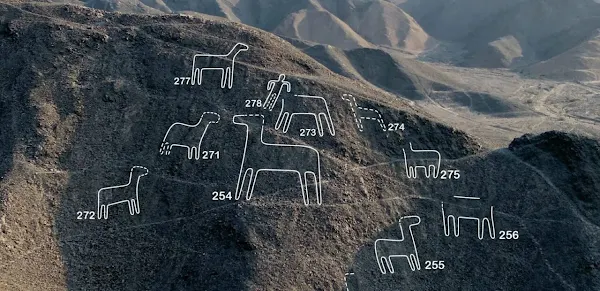 Las figuras talladas recientemente descubiertas tienen un promedio de entre 1,8 y 6 metros de largo. Estas incluyen figuras delineadas de gatos, serpientes, orcas y alpacas, según un comunicado emitido por la Universidad de Yamagata, que dirigió la investigación. Las líneas previamente conocidas miden hasta 365 metros.